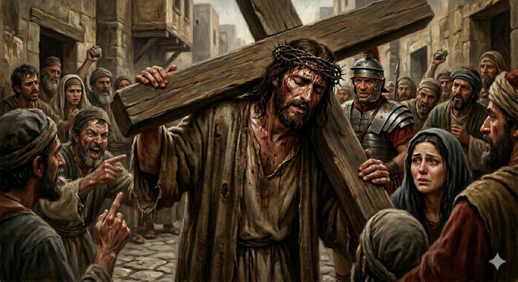 Sin dormir, sin descansar, y tras haber caminado entre 4 y 5 kilómetros desde que fue arrestado, y haber perdido unas 20 a 25 libras, Jesús todavía debía recorrer entre 600 y 700 metros de la denominada Vía Dolorosa, con el travesaño de la cruz a cuestas. Eran 20 minutos a paso lento, pero una eternidad para Cristo y para la humanidad.