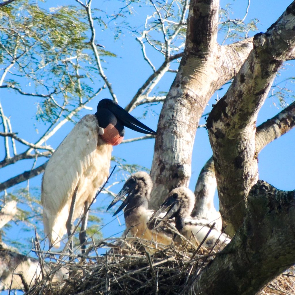 El ave jaribú es una cigüeña que puede medir más de 1.40 metros de alto, con una envergadura de casi tres metros. Se estima que solamente hay 85,000 en América. Aquí convive con dos de sus máximos depredadores: el jaguar y el humano.